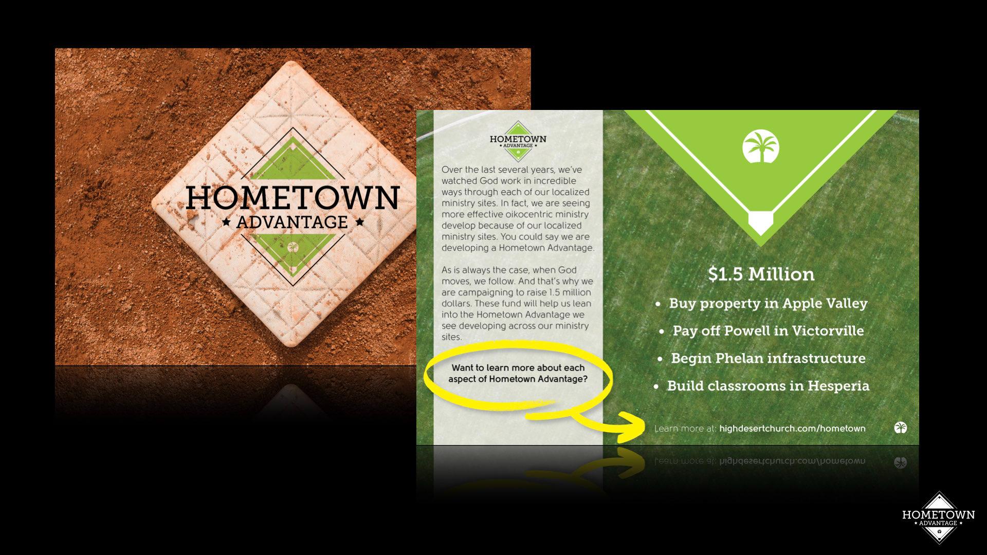 An effective capital campaign involves far more than just pretty visuals. I was fortunate to be involved early in the process of developing Hometown Advantage for High Desert Church. The goal of the campaign was to raise money for projects on each of the four ministry sites. I knew it wouldn't be easy to communicate four separate campaigns, nor would it be particularly unifying as a church, I pitched a campaign that focused on the overarching mission they were trying to accomplish. They wanted to strengthen their "hometown advantage" so they could continue to be effective in sharing the gospel with their region.