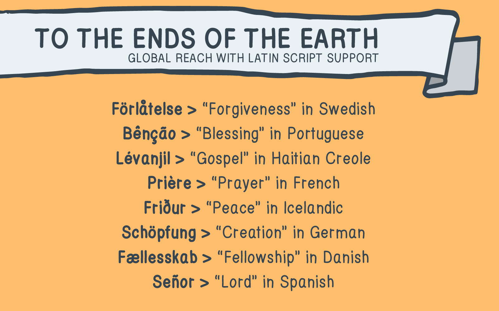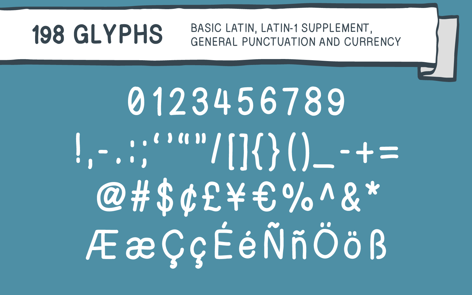 Including accented Latin characters makes KidMin Sans able to communicate your message to over 130 countries.